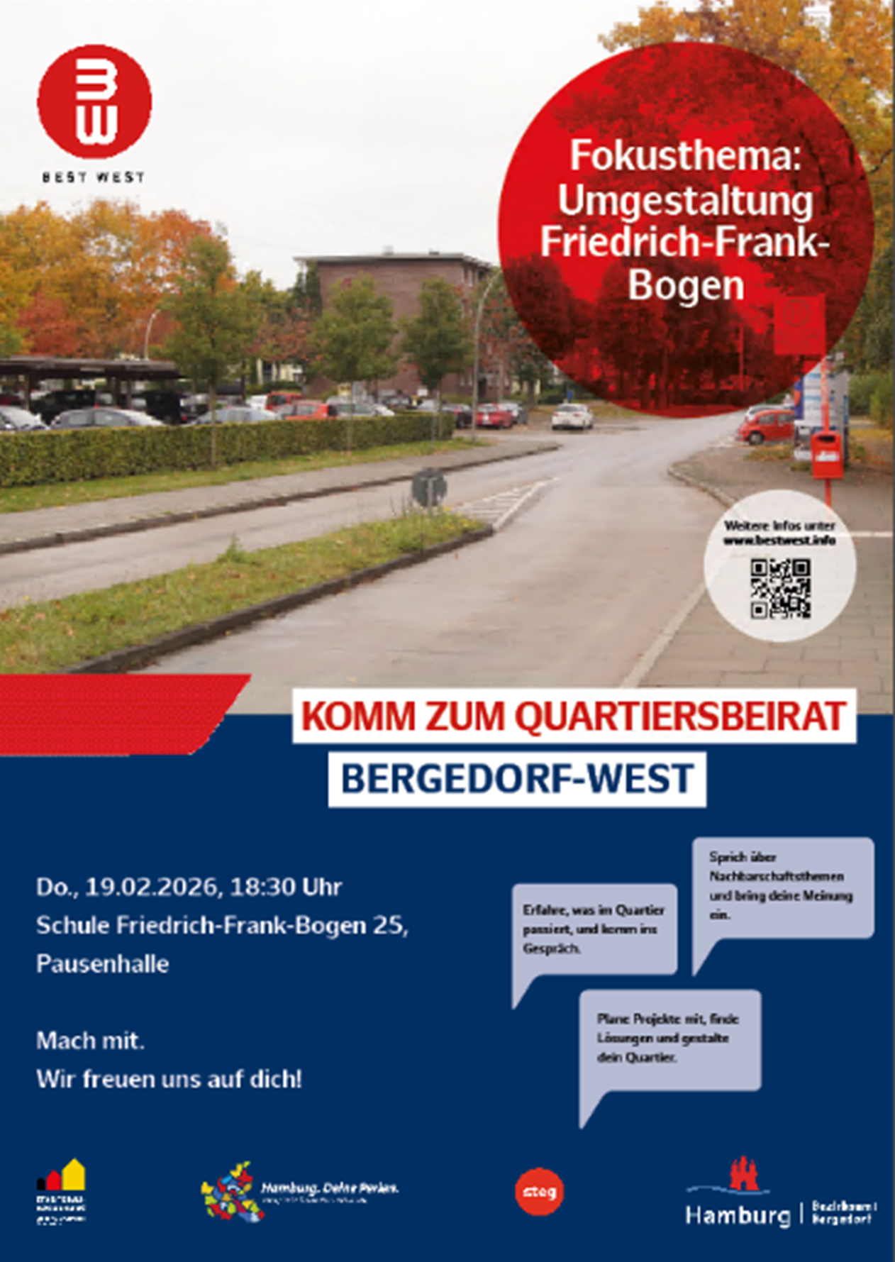 wir hoffen, Sie sind gut ins neue Jahr 2026 gestartet. Als Gebietsentwickler begleiten wir die Weiterentwicklung von Bergedorf-West gemeinsam mit dem Bezirksamt und freuen uns darauf, diesen Prozess weiterhin dieses Jahr mit Ihnen zu gestalten. Auch in diesem Jahr stehen neben baulichen Maßnahmen und Mikroprojekten im Quartier neue, stärker dialog- und informationsorientierte Formate im Fokus, mit denen wir Sie aktuell informieren und Beteiligung möglichst einfach ermöglichen möchten.